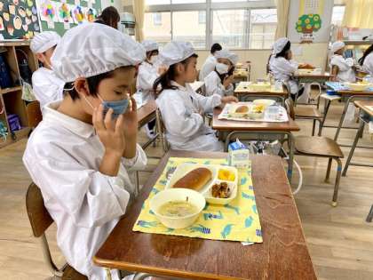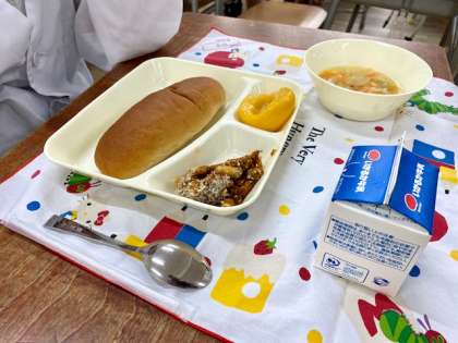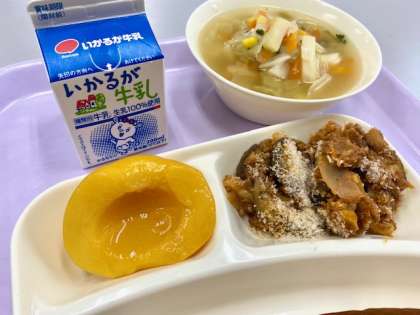 今日の給食は、なすのミートグラタン、鶏肉と野菜のスープ、黄桃でした。ミートグラタンがとてもおいしかったです。