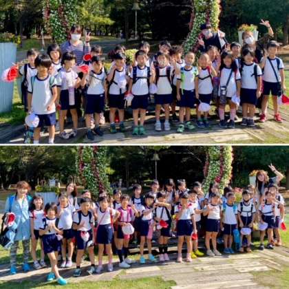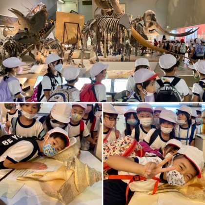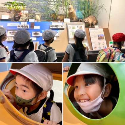 1・2年生が長居公園に遠足で行きました。公園の中は他校の子どもたちもたくさん訪れて、とても賑やかでした。自然史博物館では、恐竜の大きな骨格だけでなく、小さな昆虫の展示なども、興味津々で見ていました。