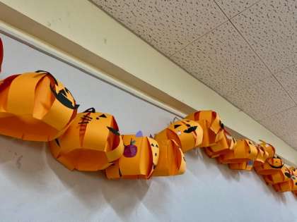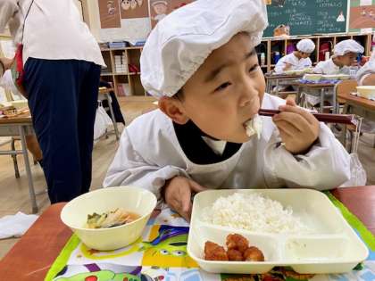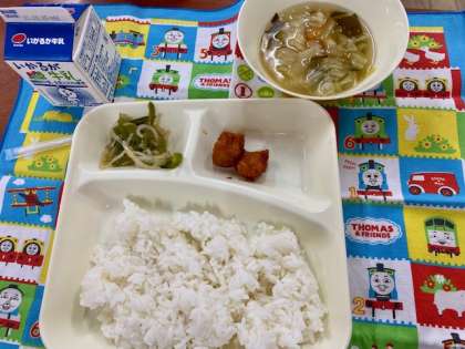 今日の給食は、まぐろのオーロラ煮、すまし汁、もやしとピーマンの炒めものでした。子どもたちは、オーロラ煮が大好きです。ご飯といっしょに、モリモリ食べます。壁のかぼちゃも、にっこりと笑っていました。