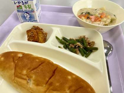今日の給食は、白菜のクリーム煮、あつあげのごましょうゆかけ、豚肉と三度豆のオイスターソースいためでした。パンもおさつパンで、いつもよりもふわふわで、甘みがありました。ボリューム感がありましたが、残さず食べていました。