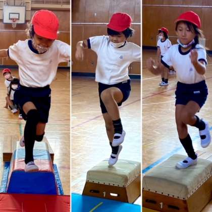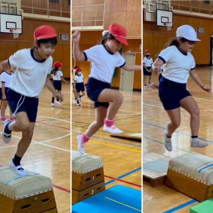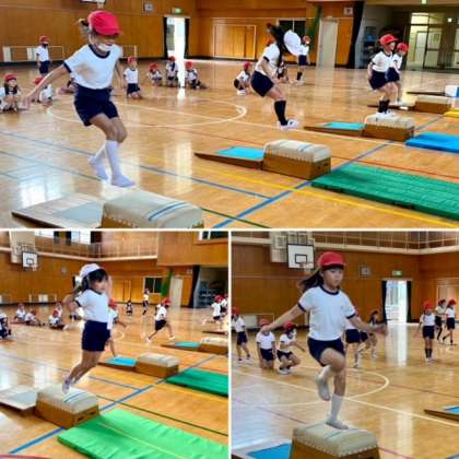 2年生が、マットととび箱をつかって、リズミカルにジャンプする運動をしました。