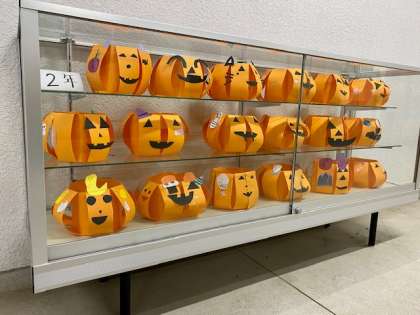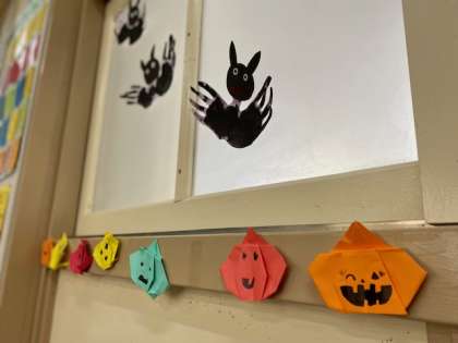 校内は、かわいいカボチャやコウモリでいっぱいです。