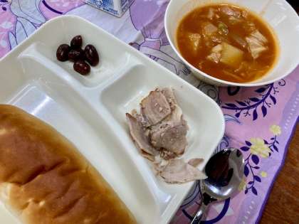 今日の給食は、豚肉のガーリック焼き、ケチャップ煮、うずら豆のグラッセでした。