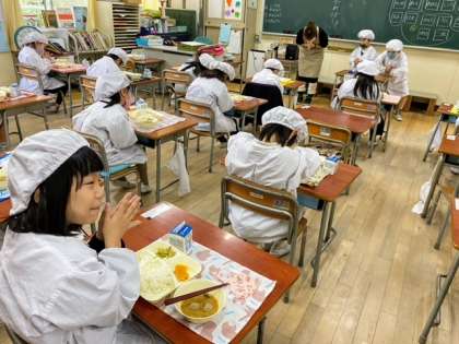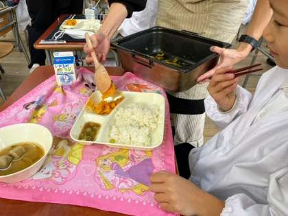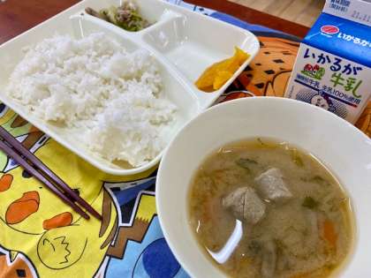 今日の給食は、豚肉とまいたけの炒めもの、いわしのつみれ汁、かぼちゃういろうでした。あったかくて、ホッとするつみれ汁、おいしかったです。