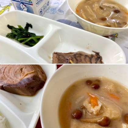 今日の給食は、なまりぶしのしょうが煮、なめこの味噌汁、ほうれん草のごまあえでした。かつおのなまりぶしは好評で、おかわりをする子がたくさんいました。ご飯がすすむ献立でした。