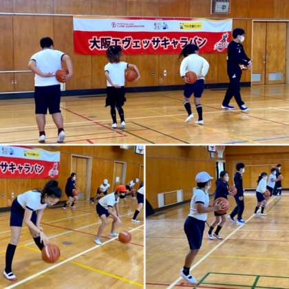 大阪のバスケットチーム「エヴェッサ」のコーチから、バスケットボールの指導を受けました。不断とは一味ちがう緊張感があり、ドリブルもシュートもうまくなった気がします。