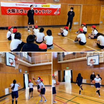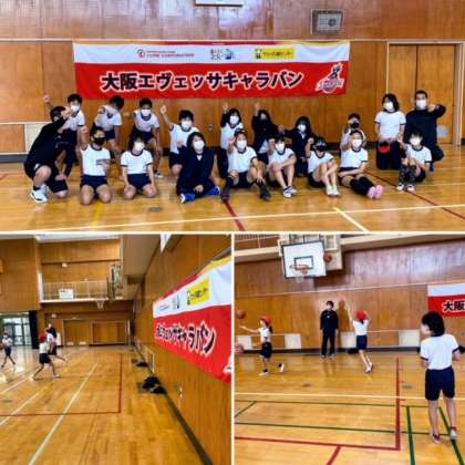 夢授業は、各スポーツの選手やコーチから指導を受ける楽しい授業です。今日は、バスケットボールチームの大阪エヴェッサからコーチが2人来てくれました。5・6年生は、真剣なまなざしで練習をしていました。