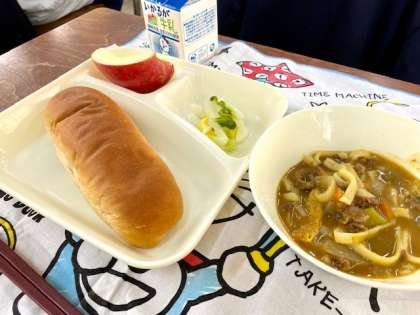 今日の給食は、カレーうどん、白菜の甘酢あえ、りんごでした。