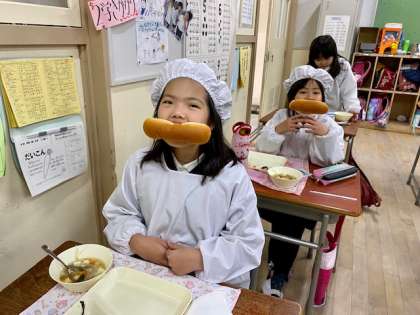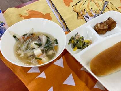 今日の給食は、あげシュウマイ、とうふのスープ、ツナとチンゲン菜の炒めものでした。