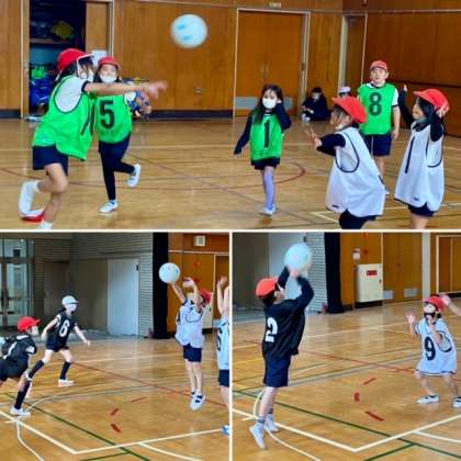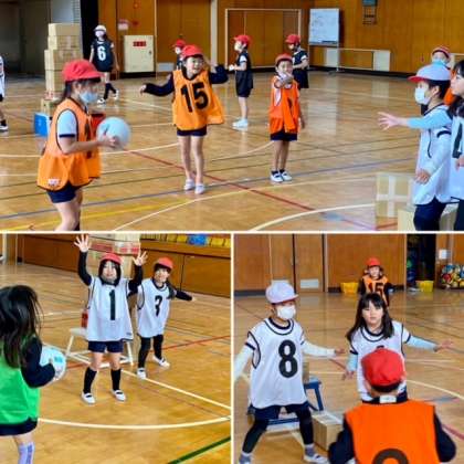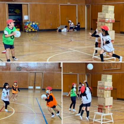 2年生は、ボールをつかって段ボールの箱をたおすゲームをしました。箱をたおされないように、ブロックしている子をすりぬけて、じょうずに投げていました。
