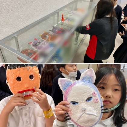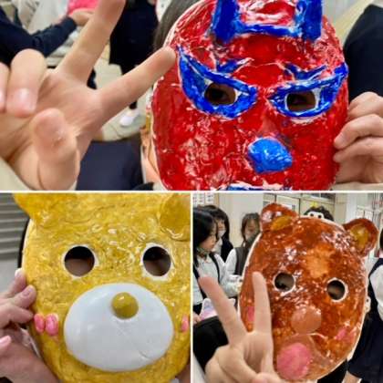 2年生のお面ができあがり、講堂前のショーケースに飾りました。