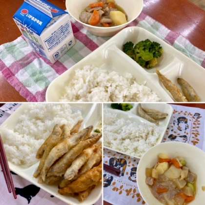 今日の給食は、きびなごの天ぷら、一口がんもとジャガイモの煮物、ブロッコリーのしょうがづけでした。