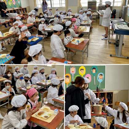 6年生が用意してくれた給食は、豚肉のデミグラスソース、スープ、キャベツとコーンのソテーでした。
