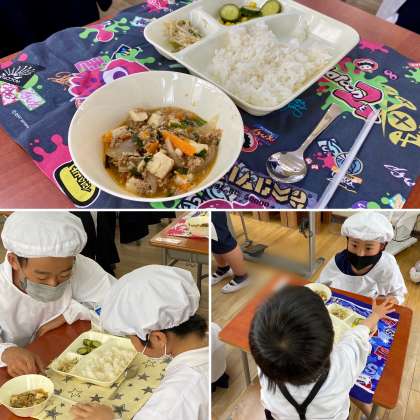 今日の給食は、マーボーどうふ、きゅうりとコーンの甘酢あえ、もやしとピーマンのごま炒めでした。