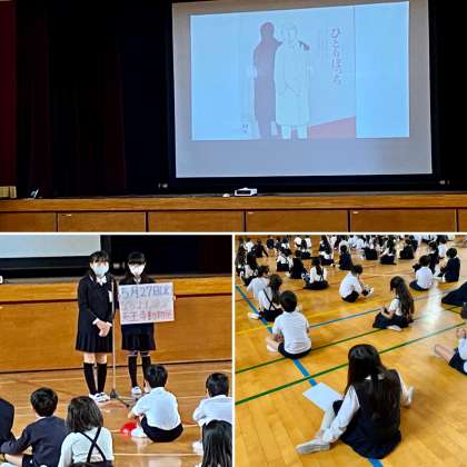 今日は全校集会で絵本を読んで、いじめについて考えました。