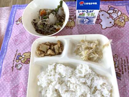 今日の給食は、肉じゃが、もやしのゆずの香あえ、ごまかかいためでした。たけのこがおいしかったです。
