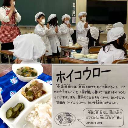 今日の給食は、ホイコウロー、鶏肉と野菜の中華スープ、きゅうりのピリ辛あえでした。