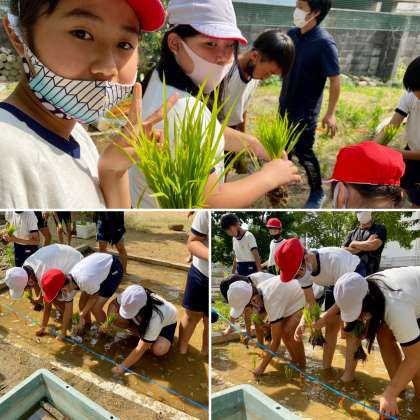 5年生が田植えをしました。秋の収穫、そして脱穀まで、米作りは続きます。