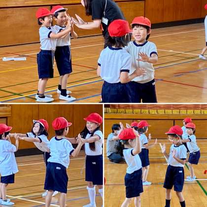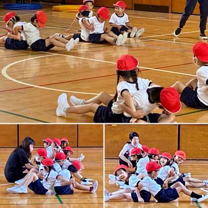梅雨空でも体育館の中では楽しく体育をしています。