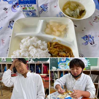 今日の給食は、和風カレー丼、すまし汁、和なし(カット缶)でした。