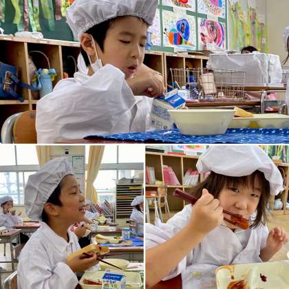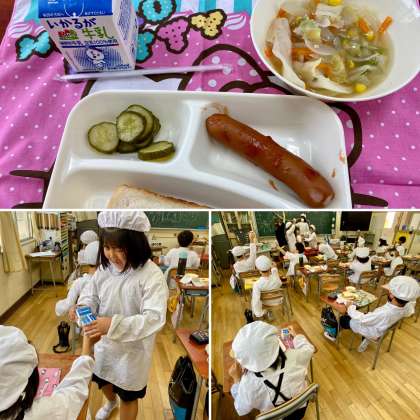 今日の給食は、ウィンナーのケチャップソース、スープ、きゅうりのサラダでした。