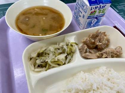 今日の給食は、鶏肉のしょうゆマヨネーズ焼き、とうがんのみそ汁、切り干し大根のゆずの香あえでした。