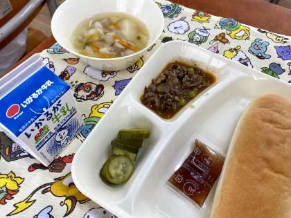 今日の給食は、牛肉のデミグラスソース煮、スープ、きゅうりのピクルスでした。