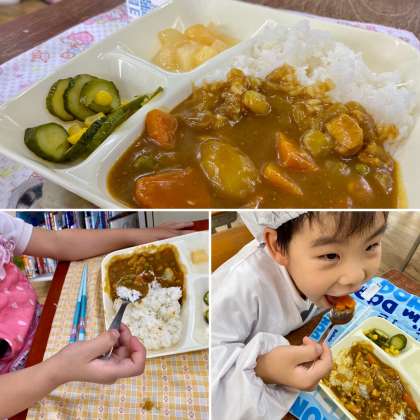 今日の給食は、チキンカレーライス、きゅうりとコーンのサラダ、白桃でした。ラッキーにんじん、嬉しそうでした。