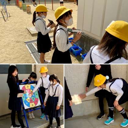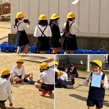 3年生が鏡を使って、光あつめをしていました。太陽光を鏡で反射させて、明るさやあたたかさを調べていました。