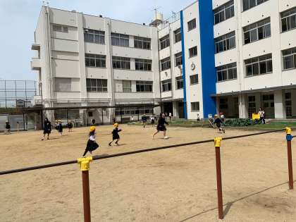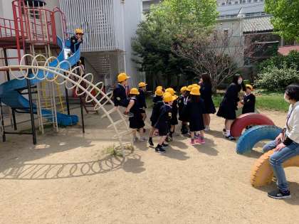 1年生と6年生でおにごっこです。 6年生がルールなどをやさしく教えています。
