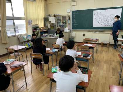 校区について調べています。みんなが知っている建物などを書き込んでいます。