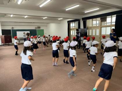 運動会の練習が始まりました。多目的室で団体演技の練習です。