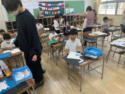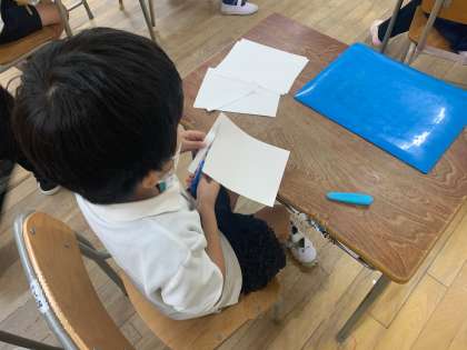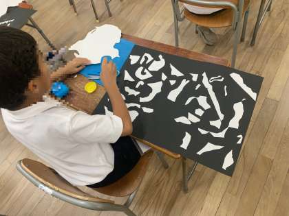 白の画用紙を切り、黒の画用紙にはっていきます。