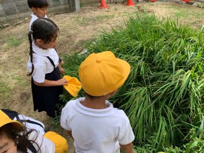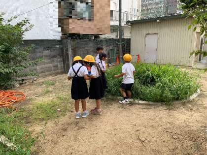 今日はいつもより少しだけ涼しく感じられました。子どもたちはビオトープで生きものさがしです。秋の虫はまだまだ見つけられないですが、バッタやカエル、メダカなどたくさんの生きものを見つけていました。