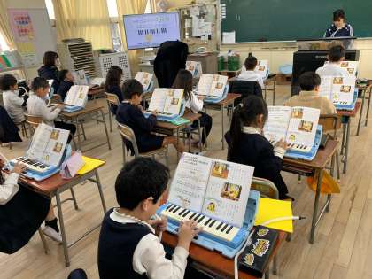 小きつねをけんばんハーモニカでえんそうしています。少しむずかしいゆびづかいですが、リズムよくえんそうしています。