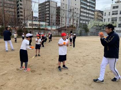 プロ野球のオリックスOBの方に来ていただき、子どもたちにティーボールを教えていただきました。