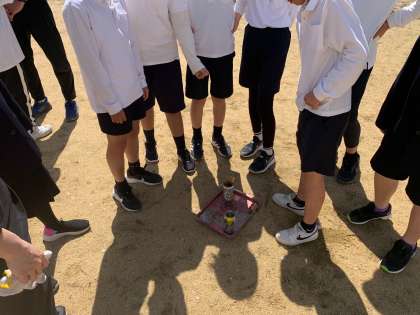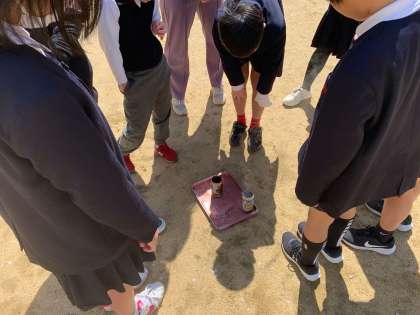 下部に穴の開いた缶と開いていない缶で中のものの燃え方の違いを観察します。