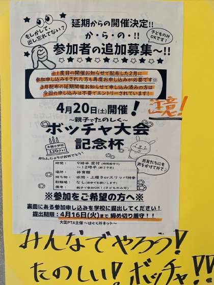 延期になっていた、PTAボッチャ大会をこの土曜日に実施します。新たに申し込む場合は、明日16日(火)が締め切りです。