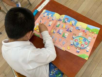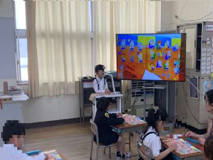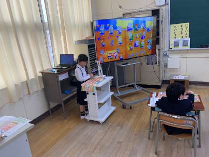 今日の数は、8です。大型モニターを使い、みんなに説明しています。