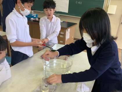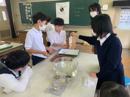 窒素、二酸化炭素、酸素を集め、燃え方の違いを実験しています。