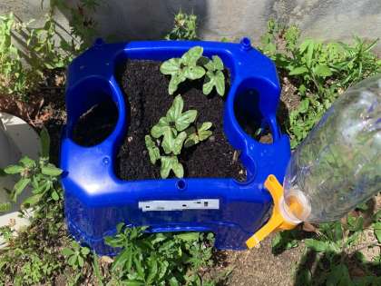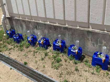 アサガオのふたばが出ました。1年生が毎日水やりをしています。