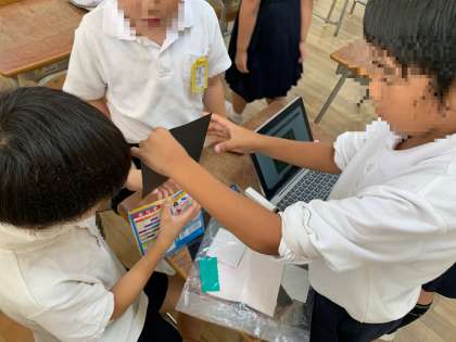 音楽の授業ででてきた「クツワムシ」について調べました。そして、色紙を使って作っています。