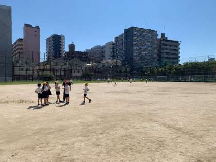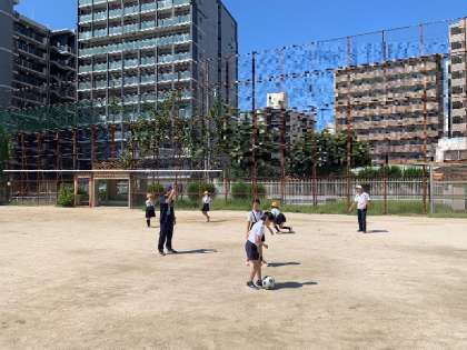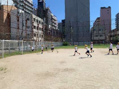 グラウンドでは、子どもたちがボールを使って、元気に遊んでいます。
