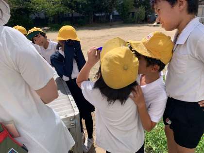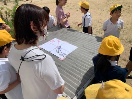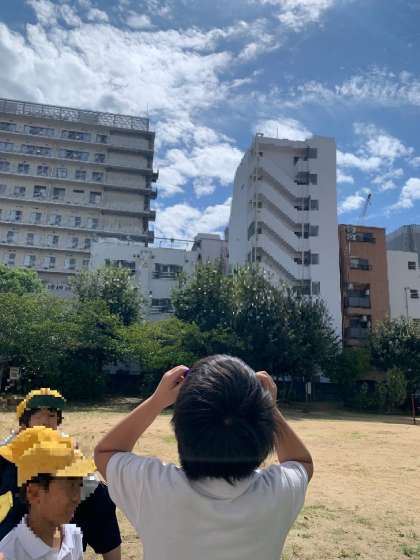 影の動きをおっていきます。たいようめがねで、太陽の位置を確かめています。