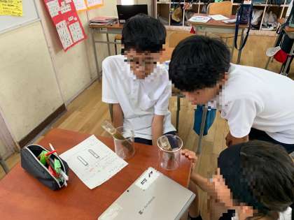 試験官に水と運動場の土を入れて混ぜ、どのように沈んでいくかを観察しています。