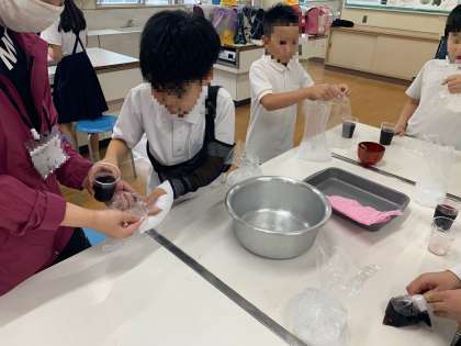 わくわくクラブ2 氷に塩を入れ、ジュースを冷やし固めていきます。