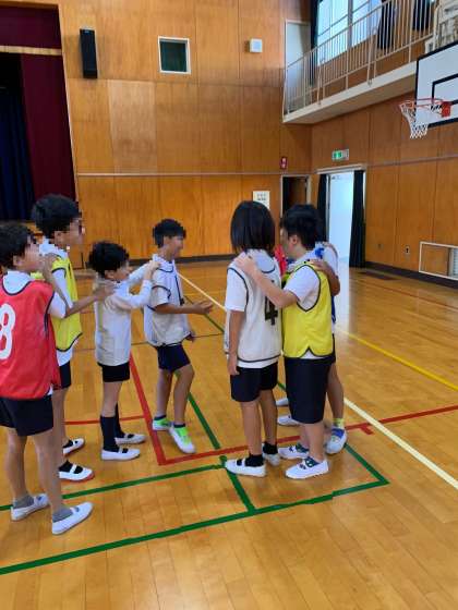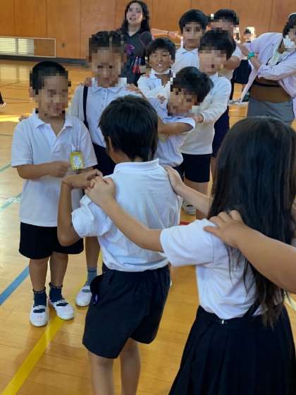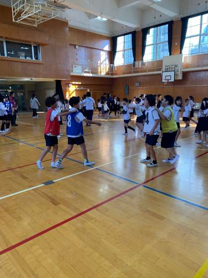 今日の児童集会はじゃんけん列車です。じゃんけんに負けた人は、勝った人の背中をもってつながっていきます。