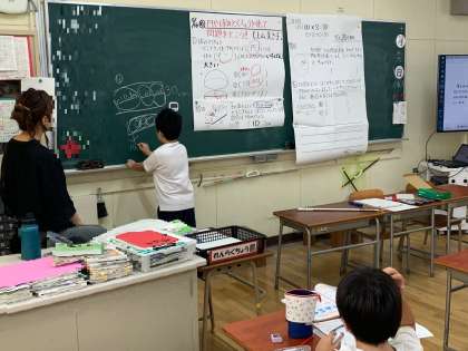 半径・直径からいろいろな長さを求めています。自分の考え方とちがう友達の意見もしっかり聞くことで、理解を深めています。