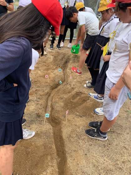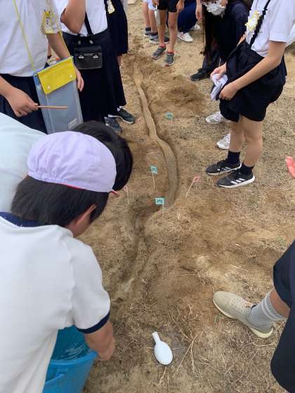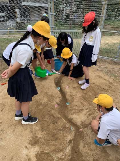 曲がっているところの内側と外側の変化を見ます。また、流された土のようすも細かく観察します。