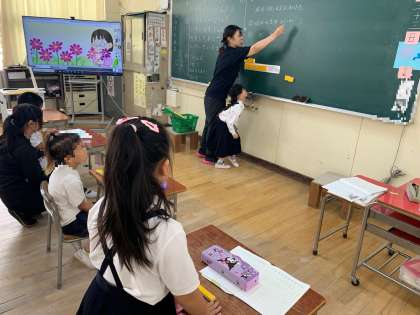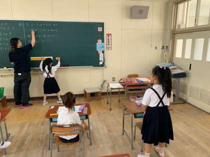 せつめいする人、ブロックをそうさする人のペアで、みんなにせつめいしています。